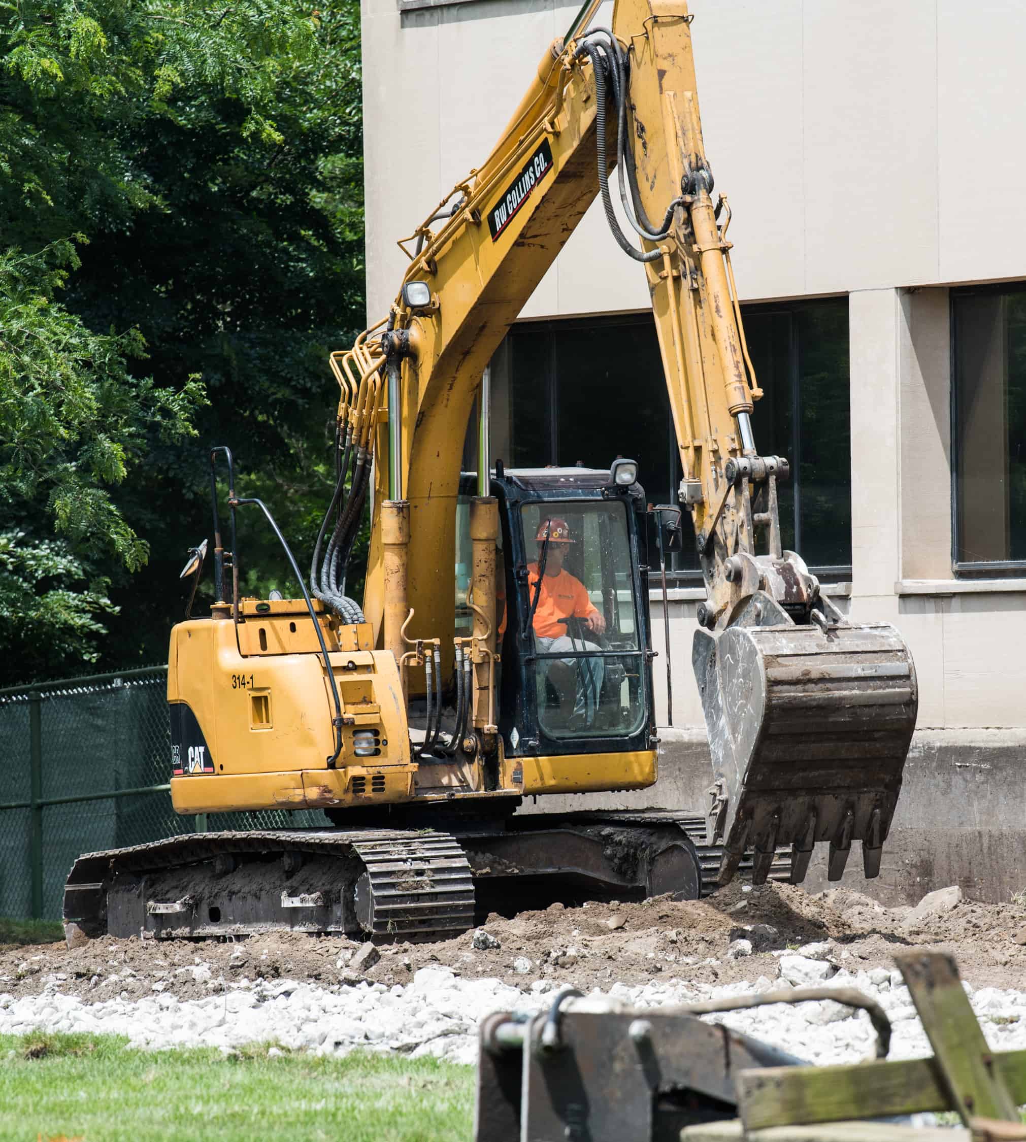 As you can see in the pictures below, there was an existing retaining wall filled with black dirt where the new student residences will stand. After our operator broke out the concrete retaining wall and footings using a Caterpillar 314 with a breaker-attachment, we excavated and hauled 400 cubic yards of black dirt. With the old retaining wall removed, the electrical substation can now be relocated so that the new residences, ranging in height from 4-14 stories, can begin construction.