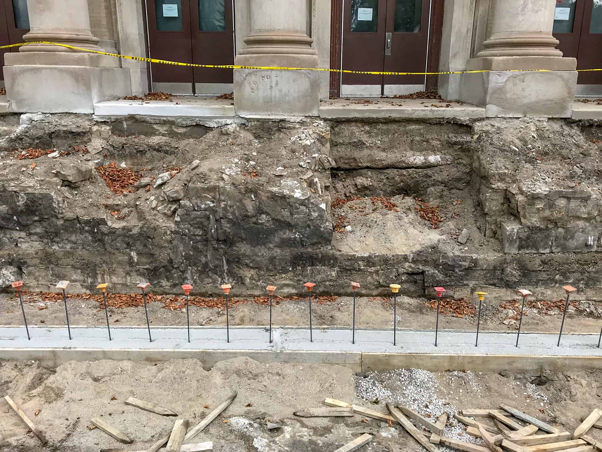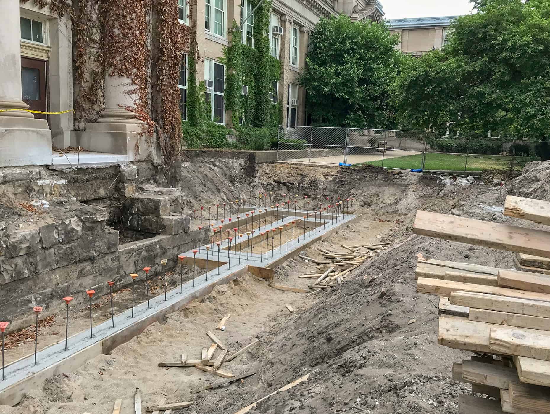 The project totaled 120-man hours, 200 cubic yards of concrete removed, 200 cubic yards of soil remediated, and 224 tons of back-fill replaced. Due to the historical significance of the building, the 105-year-old limestone, and the confined work area, our crews worked diligently to complete the project safely and on time.